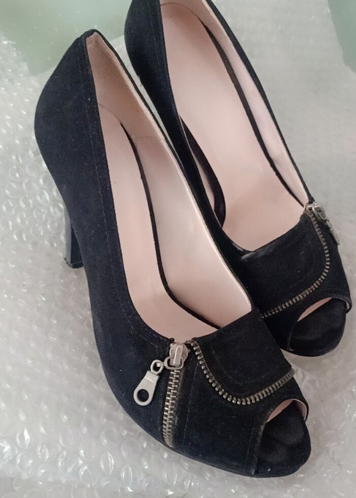 Fermuar desenli topuklu ayakkabı süet bir yapısı var topuk boyu fotoğraftaki gibidir 7 cm tahmini vardır