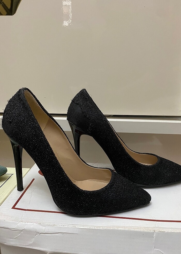 Fotoğrafta gözüktüğü gibi hafif topuk kısmında soyulma var Simli stiletto