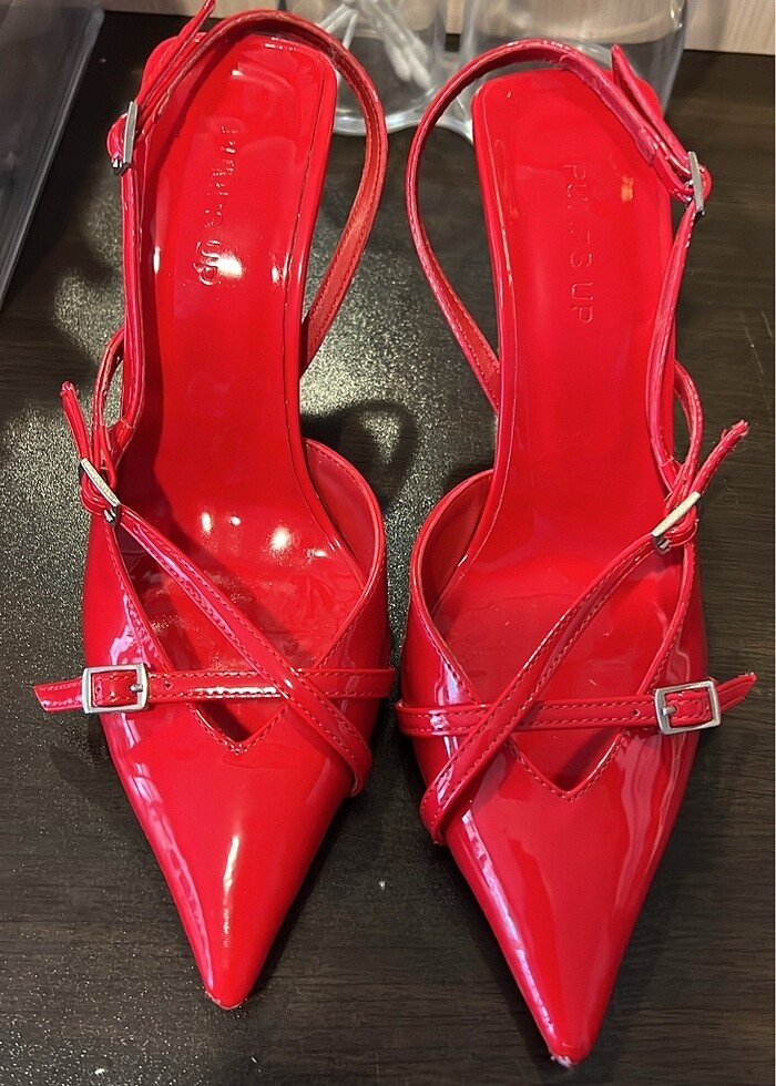 Kırmızı rugan ayakkabı.4-5 kere anca giyindim önünde hafif soyulma car ama giyinince belli olmuyor o yüzden uyguna veriyorum.Pumps up nişantaşından alındı