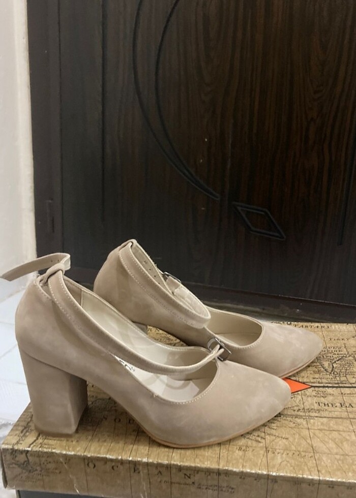 4-9 cm. Vizon kalın topuklu ayakkabı. Nubuk. Sayılı giyildi. 36 numara. Bilekten bağlamalı.