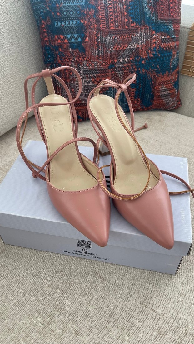 Fotoğraflarda görüldüğü gibidir. Pembe stiletto topuklu, bağcıklı ve desensiz tasarımıyla romantik akşamlar için zarif ve şık bir tercih.
