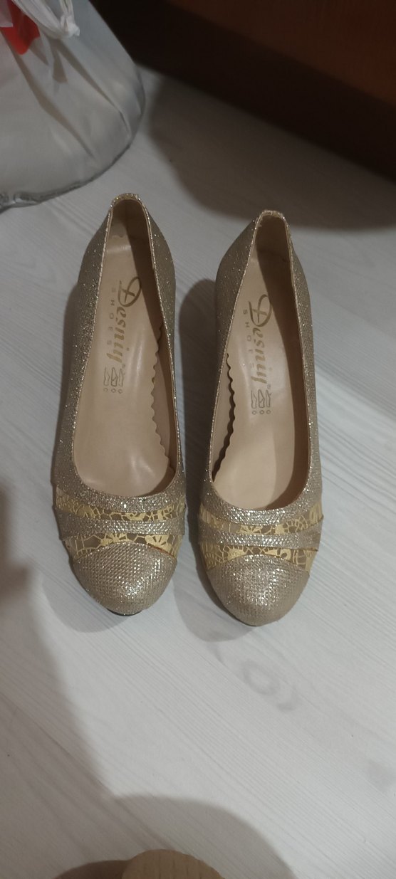 hic bir kusuru hatası yok sapasağlam Altın yansımali krem renkli dolgu topuk kadın ayakkabısı, dantel detaylı, düğün için uygun. kalitelidir sadece 1 defa giyildi temizdir düğünümde 1 saat giydim sadece