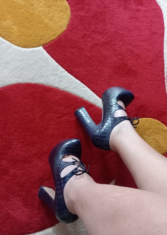 Topuk 13 cm ön platformu 4 cm hiç kullanılmadı lacivert rugan yılan derisi görünümlü önden bağcıklı orijinal kutusunda