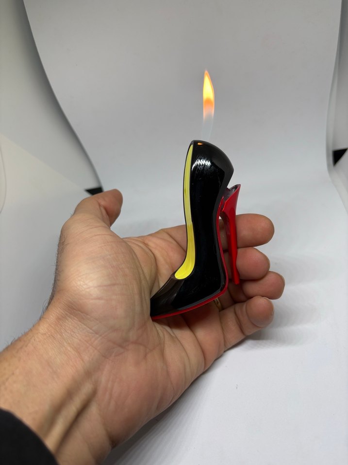 Kırmızı tabanlı siyah topuklu ayakkabı şeklinde, elde rahat tutulan ve üst kısmında alev çıkaran çakmak.