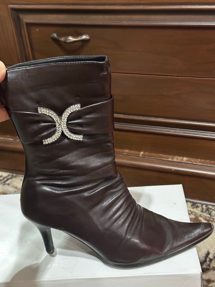 kahverengi deri yüksek topuklu bot, tokalı ve sivri burunlu. Günlük kullanıma uygun şık tasarım. Derisinde hafif kopmalar var fiyat o yüzden düşük