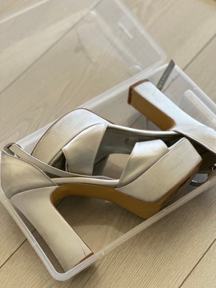 Gri tonda , platform topuklu kadın abiye ayakkabılar. Kauçuk malzemeden yapılmış, çağdaş tarzda, düğünler için uygundur.