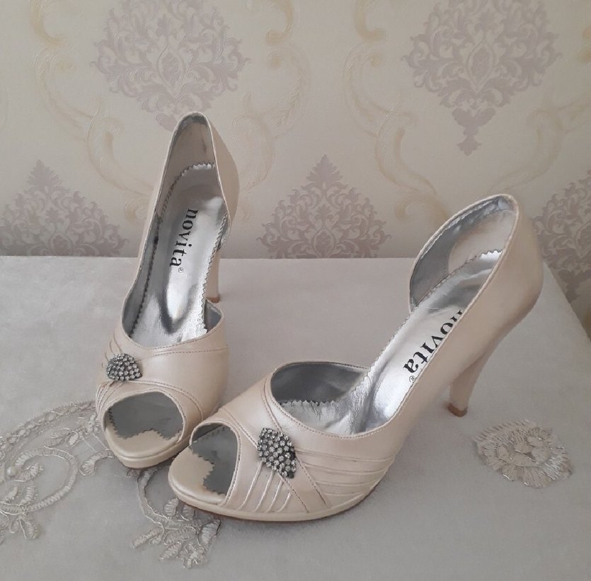 Beyaz, baskılı desenli yüksek topuklu kadın ayakkabısı. Modern klasik tarzda, düğün için uygun vintage dokunuşlu kauçuk malzemeden yapılmıştır. Marka: Novita.