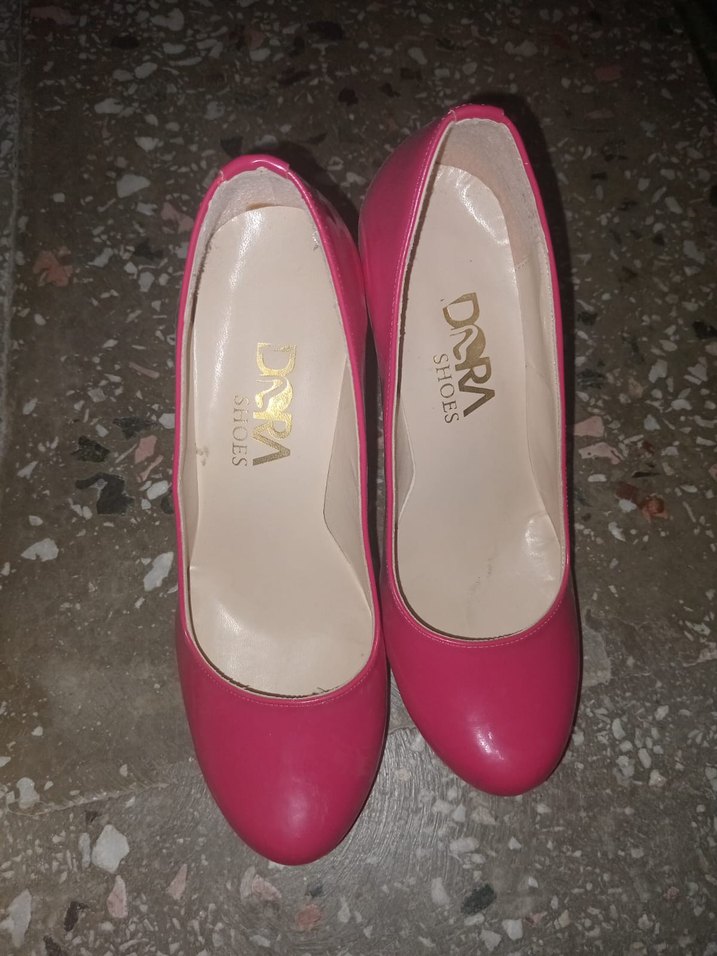 Parlak yüzeyli, baskılı detaylara sahip pembe yüksek topuklu stiletto. Kauçuk malzemeden üretilmiş, günlük kullanım için uygun.