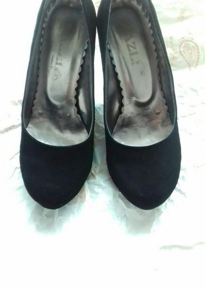 Siyah topuklu ayakkabı.defosu son resimlerde mevcut.az bir yerinde süetinde rengi gitmiş.uzun elbisenin altinda belli olmaz