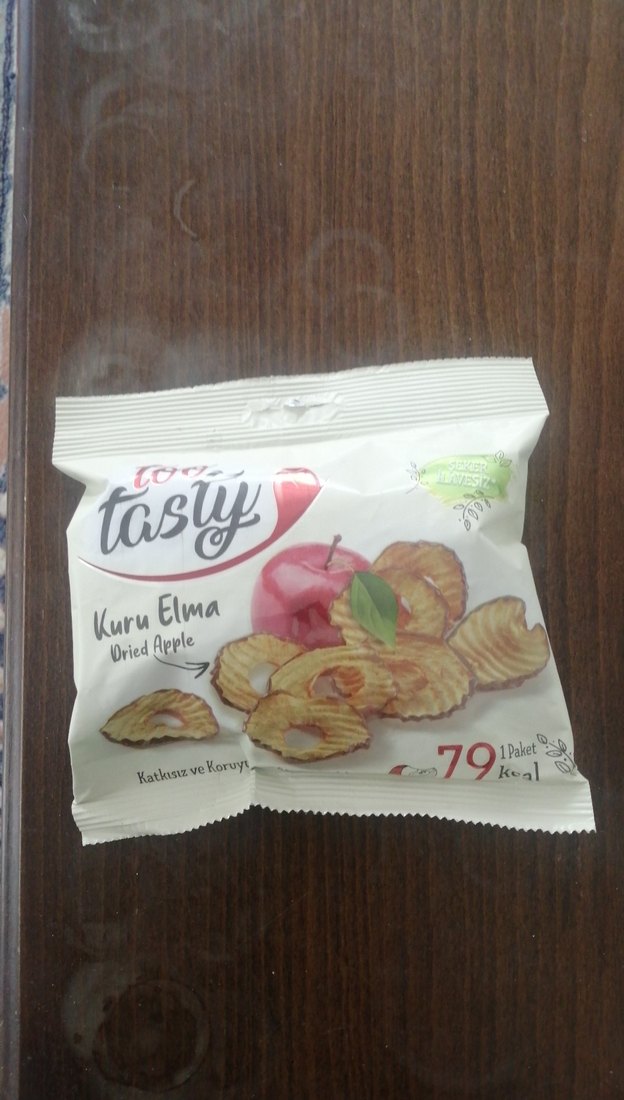Tore Tasty kuru elma atıştırmalığı, 79 kalori içerir ve tazeliği koruyan ambalajda sunulur.