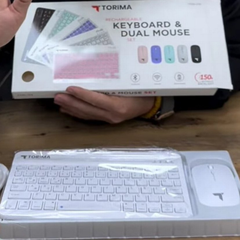 Torima şarjlı klavye ve ikili mouse seti, beyaz renkte hafif tasarıma sahiptir. Kablosuz kullanım için uygundur ve iki renkli mouse içerir.ürün sıfır kullanılmamış ambalajındadır