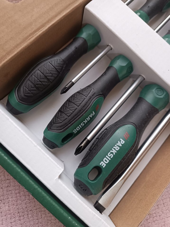 Parkside marka, koyu yeşil saplı çeşitli vidalar için tornavida seti. Rahat tutuşlu saplar kolay kullanım sağlar. ️ toplam 6 adet düz ve yıldız olmak üzere tornavida seti sıfır ürün