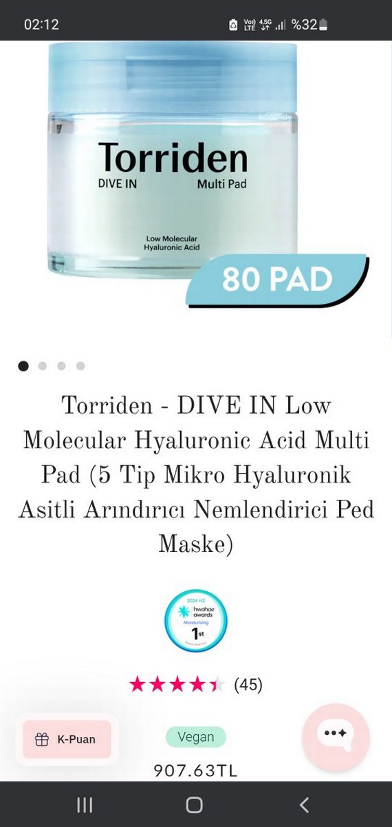 Torriden DIVE IN Multi Pad, düşük moleküler hyaluronik asit içeren 80 ped ile derinlemesine nemlendirme ve arındırma sağlar. 5 tip mikro hyaluronik asit içerir. gorseldeki gibi ürün yaridan fazla duruyor en az 50 ped kadar ürün var içinde çok az kullanıldı.