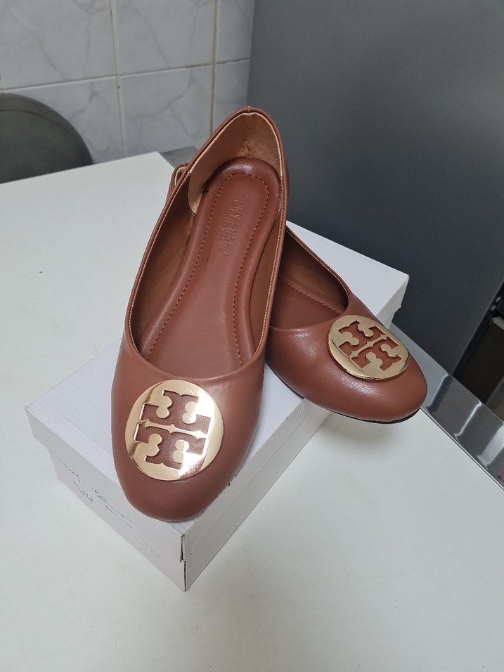 Tory Burch markalı, kahverengi parlak yüzeye sahip, tokalı ve blok topuklu kadın babetleri. Günlük kullanım ve sokak modası için uygundur.