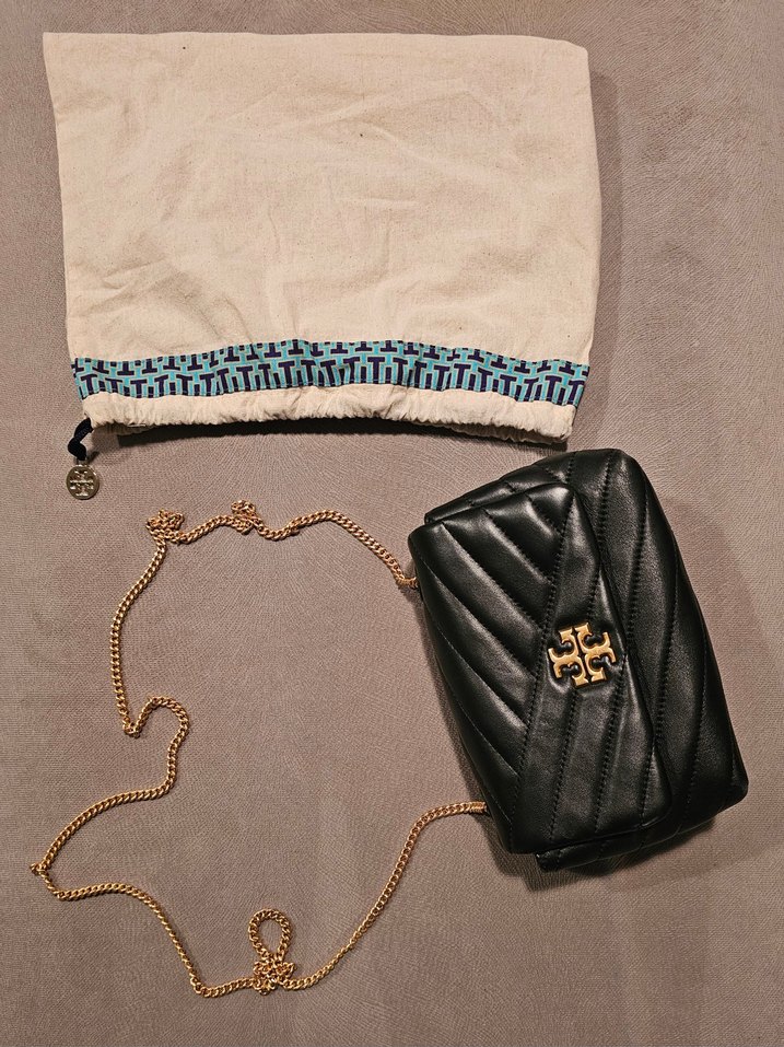 Tory Burch siyah deri kadın çapraz çanta, işlemeli detaylı ve fermuarlı kapamalı. Altın zincir askılı, Paris tarzı günlük sokak moduna uyumlu.