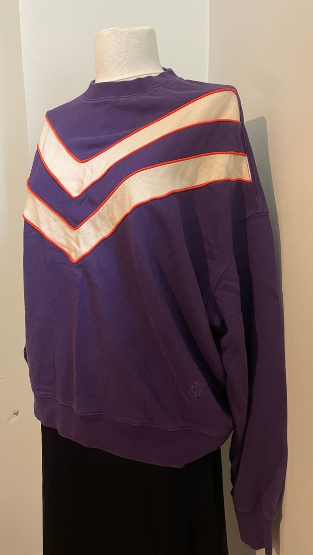 Mor renkli, bisiklet yaka ve uzun kollu bu sweatshirt, bol kesimdir. Mükemmel kondisyondadır ve hiçbir kusuru yoktur. İki koltukaltı arası 70, boyu 60 cm