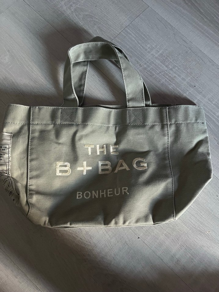 Gri sentetik kumaştan, baskılı ve tokalı detaylara sahip kadın omuz çantası. Paris sokak modasından esinlenen günlük şık tarz. "THE B+BAG BONHEUR" yazılı