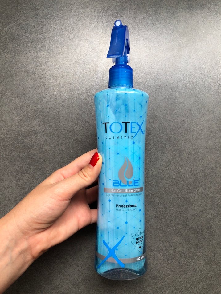 Totex Blue saç kremi spreyi fön suyu, profesyonel saç bakımı sağlar ve 400 ml şişede kolay uygulama sunar. Az kullandım