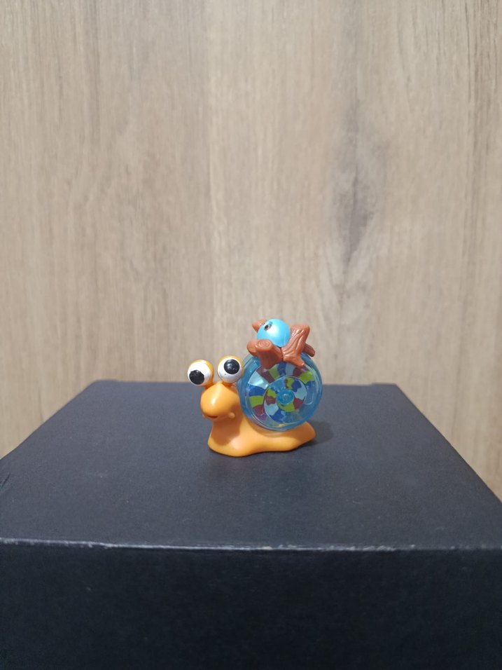 Büyük gözlü, detaylı kabuklu turkuaz renkli salyangoz figürüdür. Kabuk üzerinde küçük kuşlar bulunmaktadır.