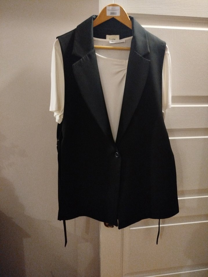 Siyah, yanlarından kemerli notched lapel yakalı, kolsuz kadın yeleği. Normal kesim ve ipeksi dokusu ile ofis ve sokak stiline uygun.