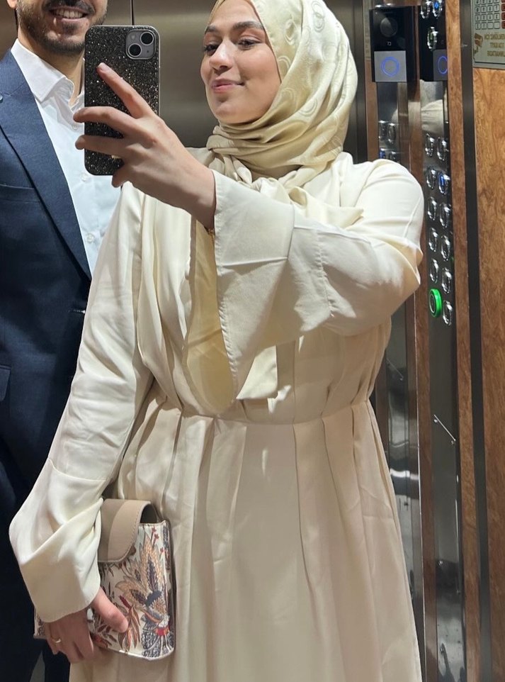 Uzun boy, bol kesim ve uzun kollu krem kadın elbise, Paris sokak modasını yansıtan sade ve desen içermeyen hafif kumaşa sahiptir. Touche bir iki kez giyildi