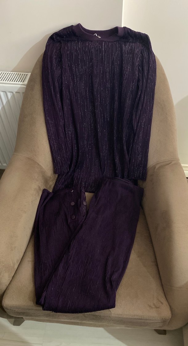 Mor renkli, pilili ve uzun kesim, yumuşak sentetik kumaştan yapılmış, ofis için uygun şık ve rahat kadın pantolonu.