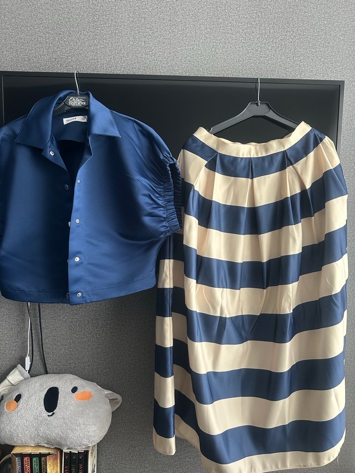 Parlak mavi renkli, pilili etek ve yelek, sentetik kumaştan üretilmiş, bol kesimdir. Günlük kullanıma uygun, Paris tarzı sokak giyimi.
