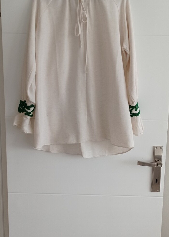 Mağazadan alınmış gibidir rengi kremin daha açık bir tonudur kolları işlemeli dugmelidir. Her renkte uyumludur günlüktür kumaşı ketendir oldukça rahattır. Sadece arka kısmında çok hafif dikiş yerleri açılması var başka hiçbir sıkıntısı yoktur. Ön uzunluk 73 arka uzunluk 78 cm iki koltuk altı mesafesi 60 cm dir