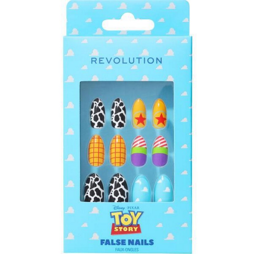 Toy Story karakterlerinden esinlenen inek desenli, yıldızlı ve çizgili çok renkli takma tırnaklar. Revolution markasına ait.