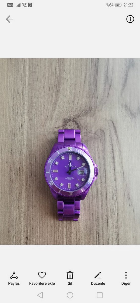 Mor renkli kadın kol saati, taşlı detaylara sahip. Minimalist ve pop kültür tarzını yansıtan, trend casual kullanıma uygun. ⌚ Ürün gayet iyi durumda canlı mor renkte hafif bir saat. Pili yok.