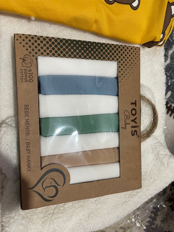 %100 pamuklu, yumuşak dokulu bebek mendili seti. Açık haki, yeşil ve mavi desenlerle günlük kullanıma uygun.