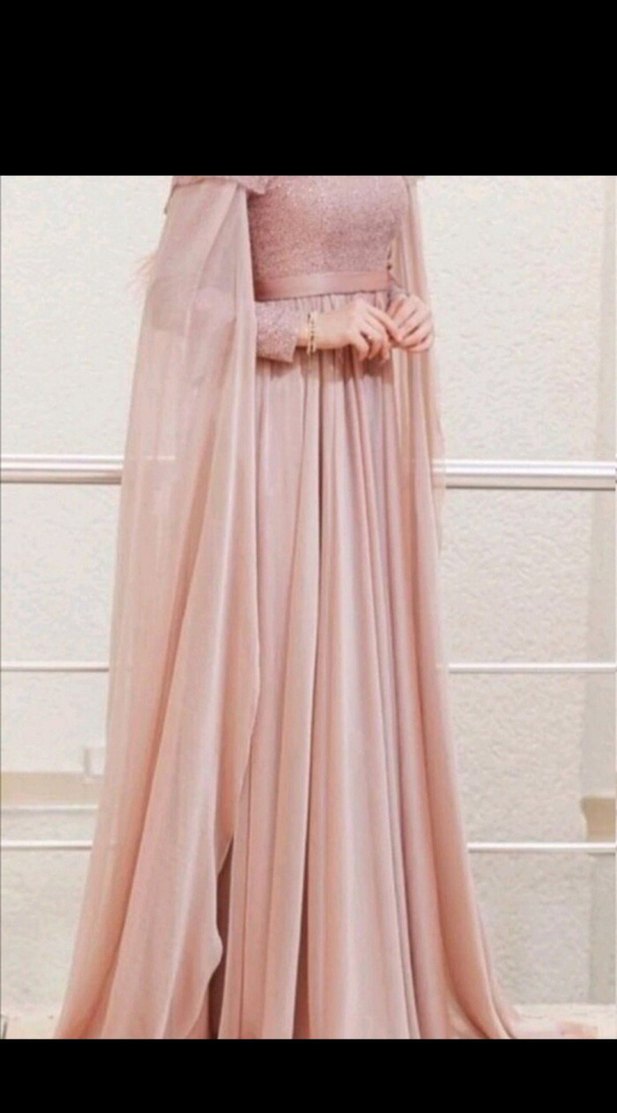 toz pembe rengi, straplez yakalı ve uzun kollu, drapeli, modern klasik kesim uzun abiye elbisedir. Düğün ve özel davetler için uygundur. şalı hediye olarak gönderilecektir