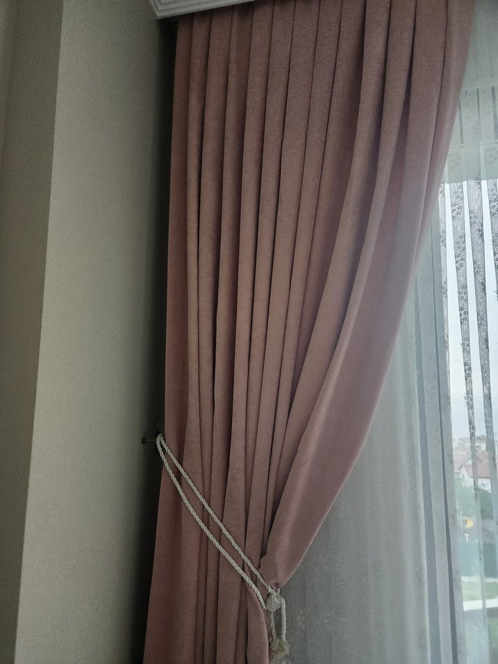 Pembe renkli, desensiz ve klasik tarzda fon perde. Yumuşak dokulu olup, ayarlanabilir bağcık ile kullanılır.