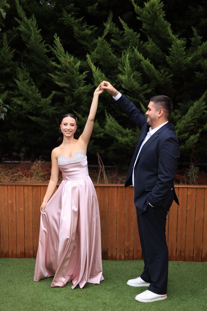 Toz pembe göğüs kısmı taşlı abiye