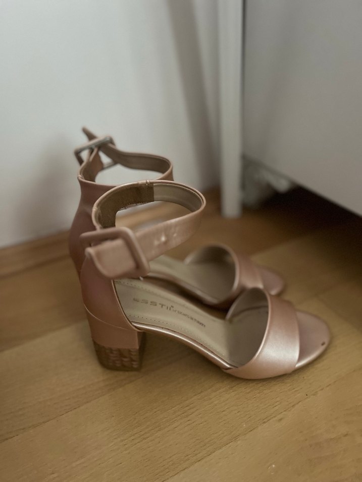 Toz pembe renkte, tokalı bantlı, kauçuk malzemeden yapılmış blok topuklu sandaletler. Minimalist ve desensiz tasarıma sahip, günlük kullanıma uygun modern ve şık ayakkabılar. 38 numara bir gün giyildi