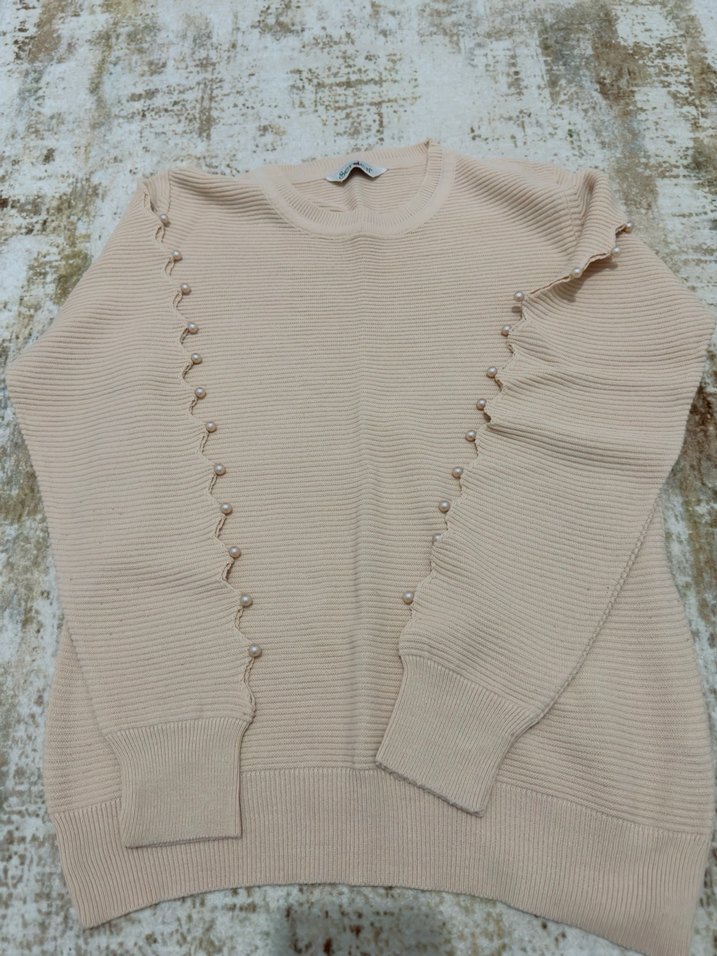 Toz pembe, uzun kollu ve yuvarlak yaka örme kazak, kol boyunca inci detaylarıyla süslenmiştir. Salaş kesimiyle rahat bir görünüm sunar.