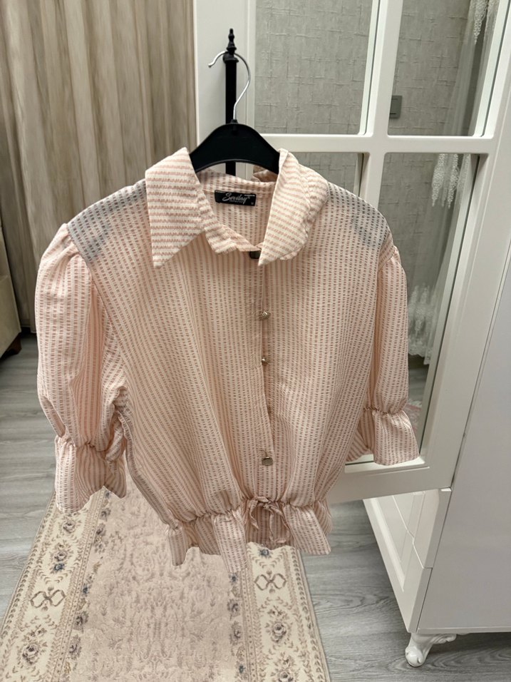 Toz Pembe Kısa Kollu Keten Mini Gömlek
