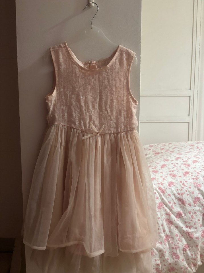 Kolsuz, V yaka ve fırfırlı detaylara sahip bej kız elbisesi, yumuşak sentetik kumaştan üretilmiş, klasik ve bohem tarzda bir modeldir.