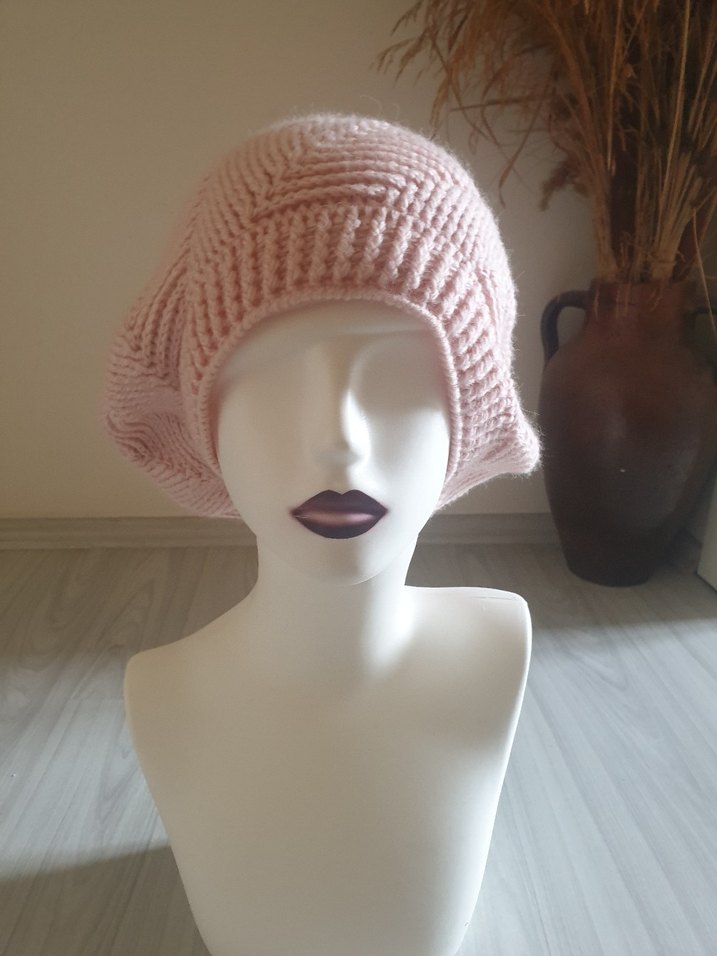 Toz Pembe Örgü Bohem Kadın Bere genis kesimdir.