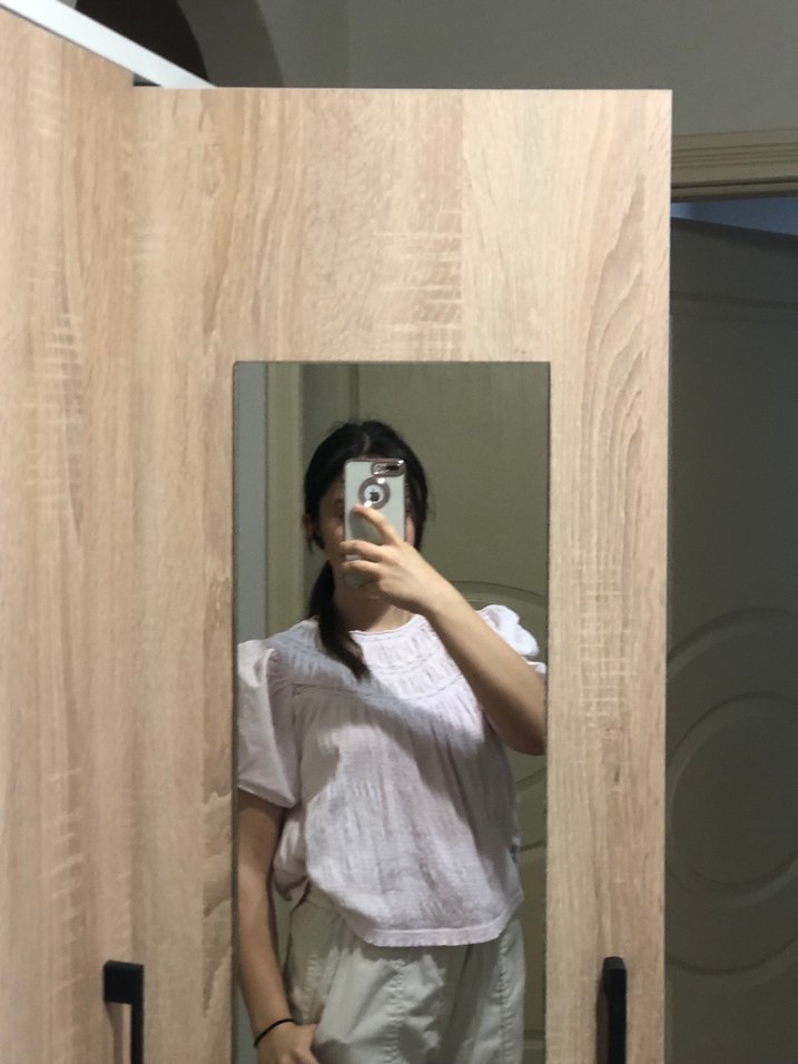 Toz pembe pamuklu bluz, kısa kollu, düz yakalı ve bol kesimdir. Dantel detayları ve tül prenses kolları bulunmakta. Az giyildi etiketsiz. Boyu 50 cm