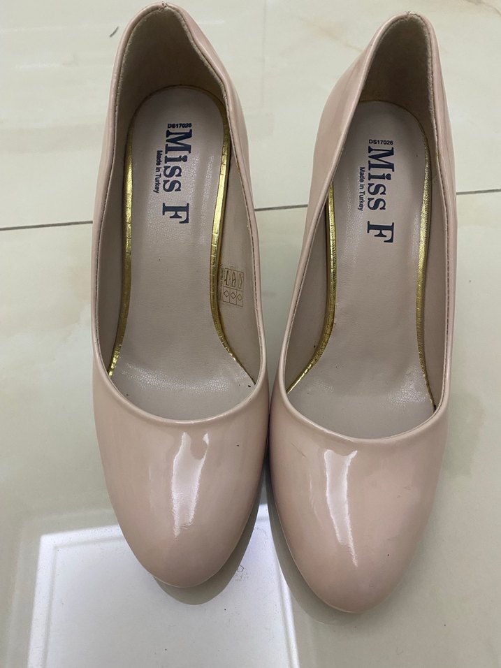 Bej renkli, parlak yüzeye sahip stiletto topuklu kadın ayakkabısıdır. Sayılı giydim tertemiz