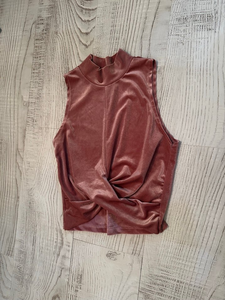 yumuşak süet kumaştan yapılmış, kolsuz yüksek yakalı ve vücuda oturan bu atlet, önde drapeli detaylara sahip. Parlak dokusu ile günlük ve sokak stiline uygun.