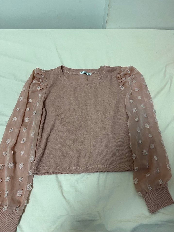 Toz pembe renk, uzun kollu, yuvarlak yakalı ve bol kesim kadın bluz. Fırfırlı detaylara ve desenli tüllü kollara sahip, yumuşak sentetik kumaştan üretilmiştir. Rahat sokak stili için uygundur.