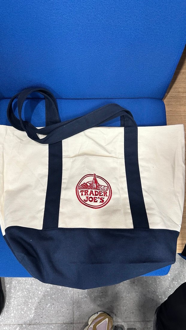 Keten kumaştan yapılmış, üzerinde Trader Joe's baskısı bulunan kadın tote çanta. Lacivert saplara ve geniş iç hacme sahiptir. Günlük sokak stili için uygundur.
