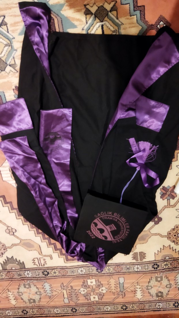 Trakya üniversitesi sağlık bilimleri fakültesi kep cübbe görselde ki gibidir birkaç saat giyildi sağladığımız yerde kurdelesi düşmüş yapıştırılır yapıştırılmadan da kullanılabilir. birkaç saat bir şey için o kadar para vermeyin
