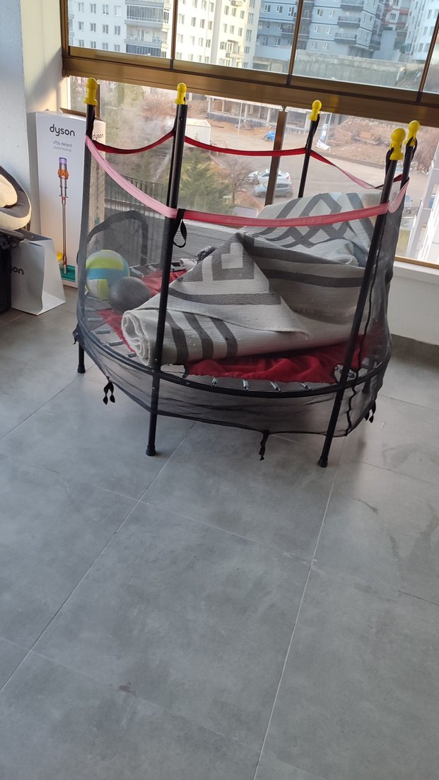 Yuvarlak oyun parkı yatak, kırmızı çerçeve ve gri yatak örtüsü ile siyah file kenarlara sahip, çocuklar için güvenli ve rahat bir alan sağlar. ️
