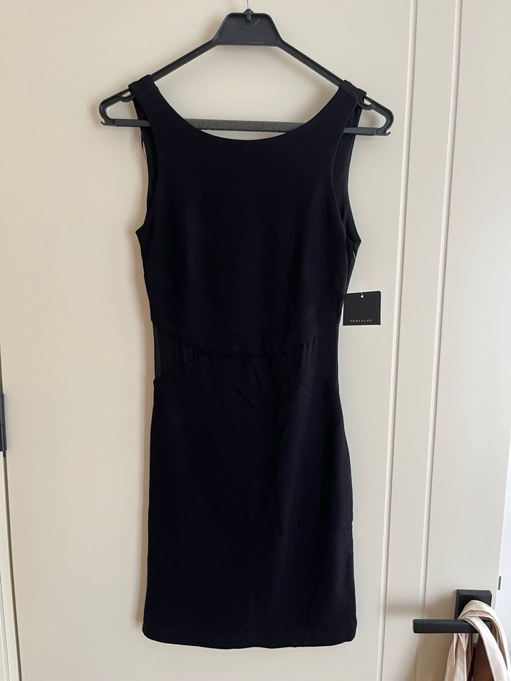 Siyah, mini, penye kumaş elbise. Belinin ön tarafında transparan detaylar mevcut. Arkasındaki V detayıyla çok zarif. Etiket M fakat S bedene daha uygun. Etiketli, hiç giyilmedi.