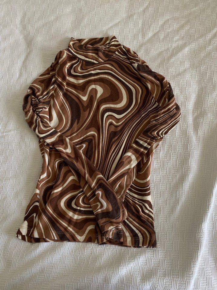 Kahverengi batik desenli, bohem tarzı, boğazlı ve uzun kollu, vücuda oturan rahat bir bluz. Günlük kullanıma uygundur.