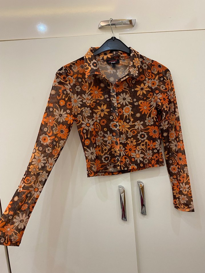 Ürünün defosu veya kusuru yoktur,üzerinde turuncu ve tonlarında çiçekleri mevcuttur ve ürün tranparan kumaştadır.