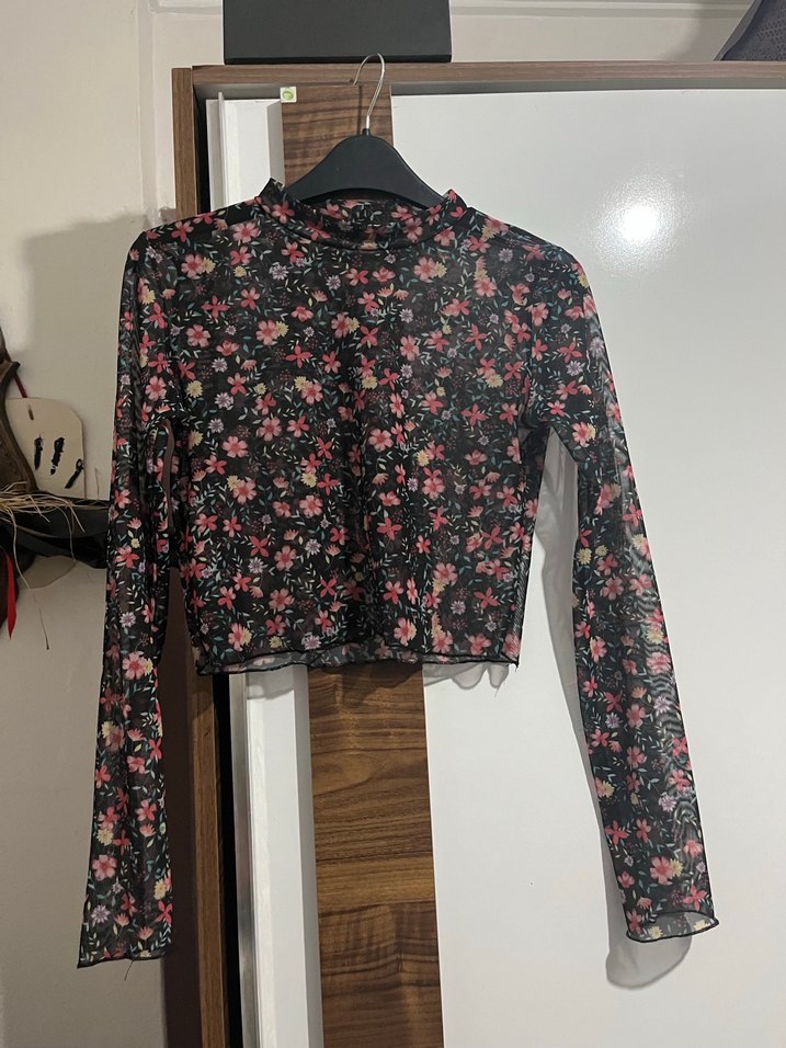 çiçek desenli siyah, uzun kollu, yüksek yakalı, kısa kesim mini bluz.